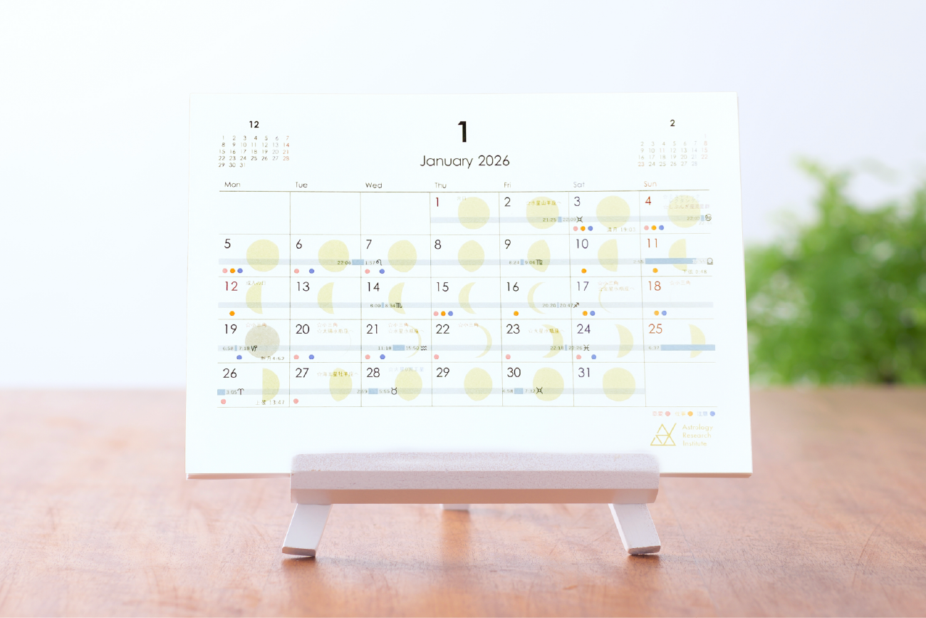 新月カレンダーは、新月のホロスコープ解説に加えて、自分のホロスコープのどの場所で起きて、どういう影響が起きるのか、さらにはその星座のキーワードが記載されていて、とっても便利です。月間カレンダーには、天体の星座移動のタイミングに加えて、重要なアスペクトが出来る日ものっていますし、ハーフサムや天体の運行状況に基づいた恋愛運、仕事運のよい日や注意日も書いてあり、2026年の予定をたてるのになくてはならないカレンダーです。自信をもっておススメします!