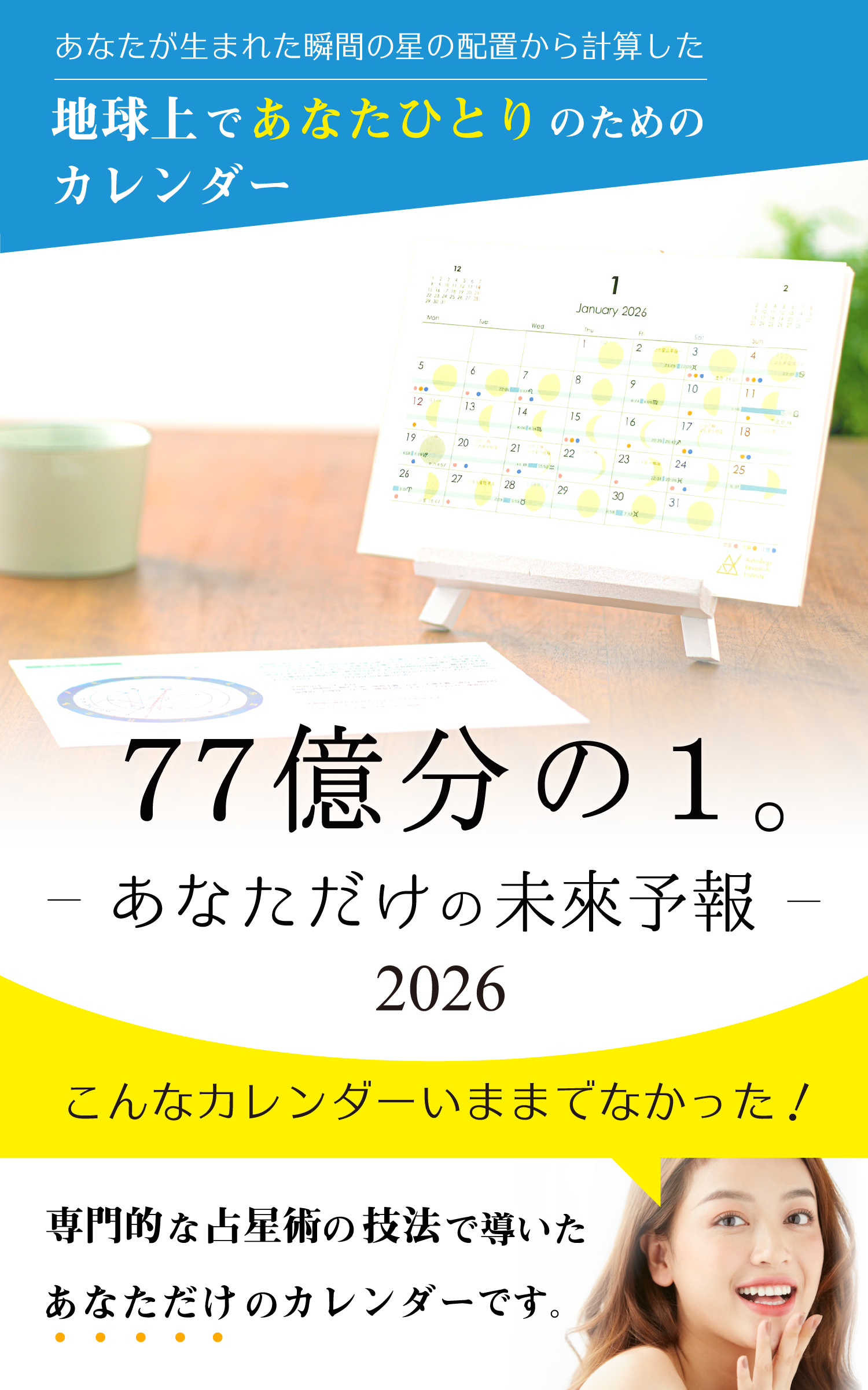 新月カレンダーは、新月のホロスコープ解説に加えて、自分のホロスコープのどの場所で起きて、どういう影響が起きるのか、さらにはその星座のキーワードが記載されていて、とっても便利です。月間カレンダーには、天体の星座移動のタイミングに加えて、重要なアスペクトが出来る日ものっていますし、ハーフサムや天体の運行状況に基づいた恋愛運、仕事運のよい日や注意日も書いてあり、2026年の予定をたてるのになくてはならないカレンダーです。自信をもっておススメします!