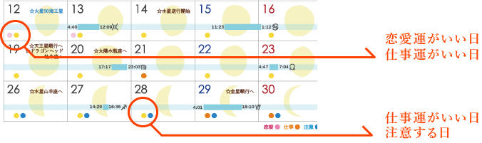 2025年10月~2026年12月まで、毎月のカレンダーに、あなたの恋愛運、仕事運がいい日、注意すべき日をカラーで表示しました。